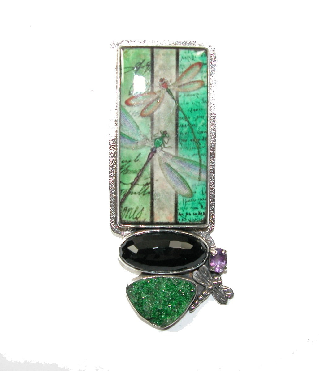 31068 Handmade Tile Dragonfly with Black Onyx and Amethyst Sterling Silver Pin Pendant