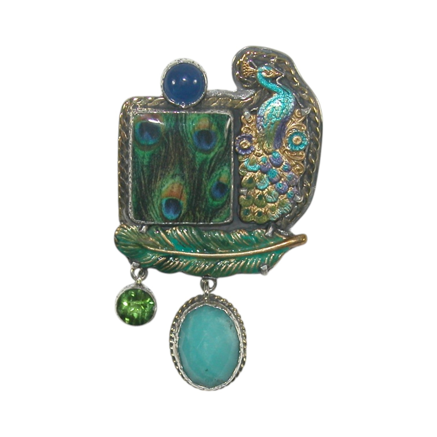 Handmade Tile Enamel Peacock with Lapis, Amazonite and Celestial Quartz Sterling Silver Pin Pendant