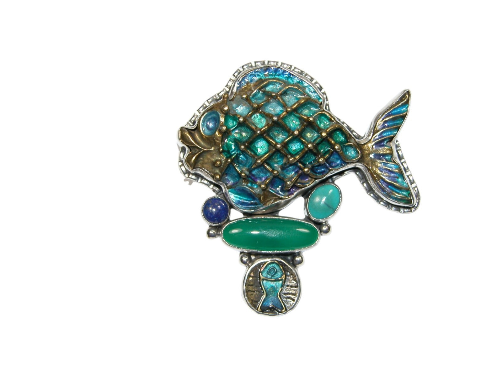 32629 Large Blue and Green Hand Enameled Fish with Green Onyx