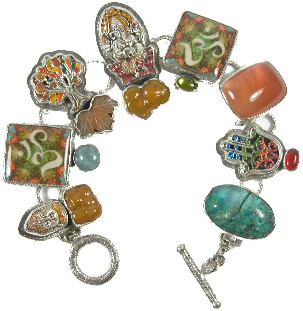 Moonstone Carnelian Chrysocolla Om Ganesh Sterling Silver Bracelet