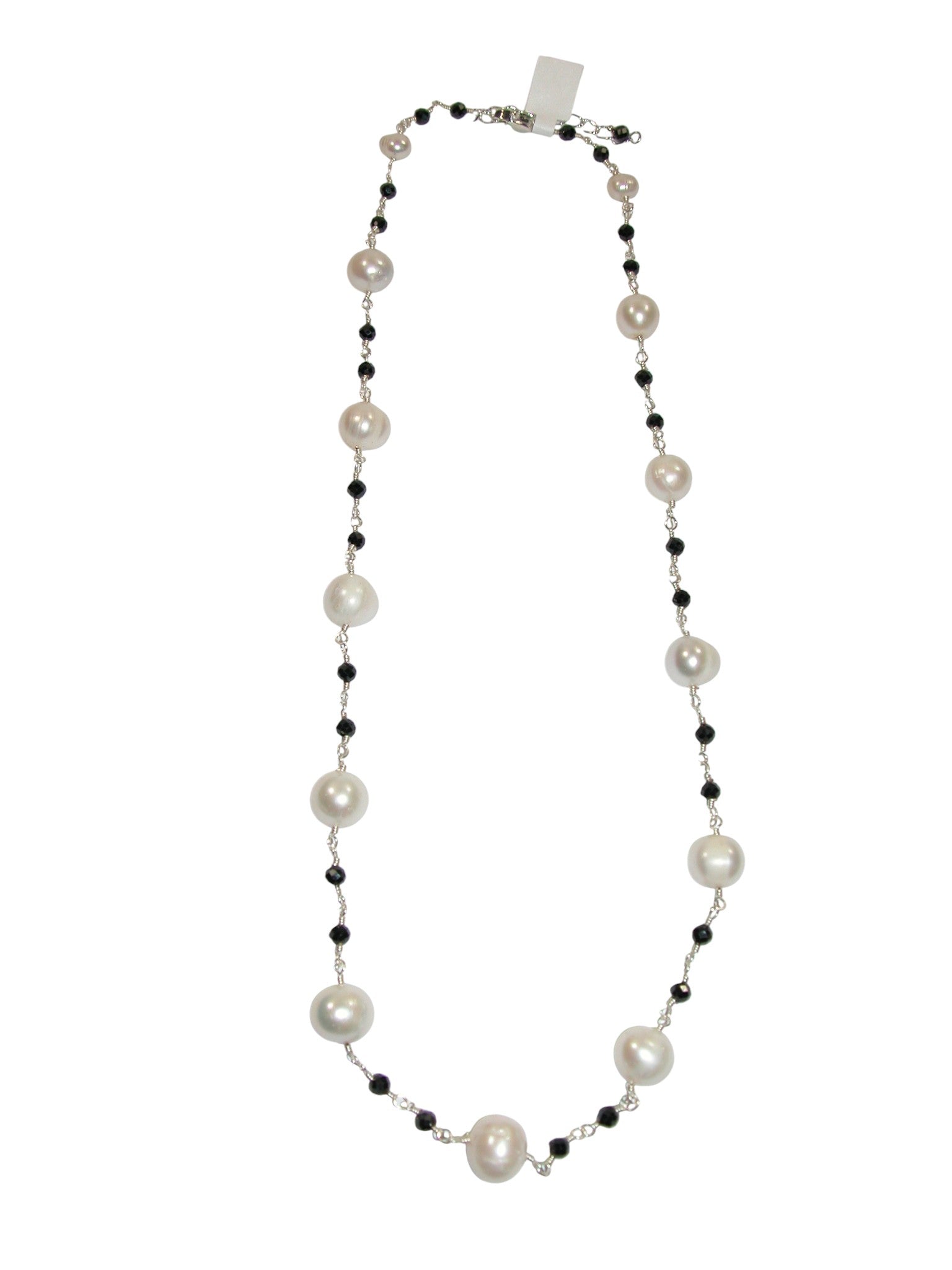 This is a classic rosary style necklace with white freshwater pearls and black faceted crystals and a lobster claw clasp with a 2 inch extender chain to add length. The length of this necklace is 20- 22 inches.