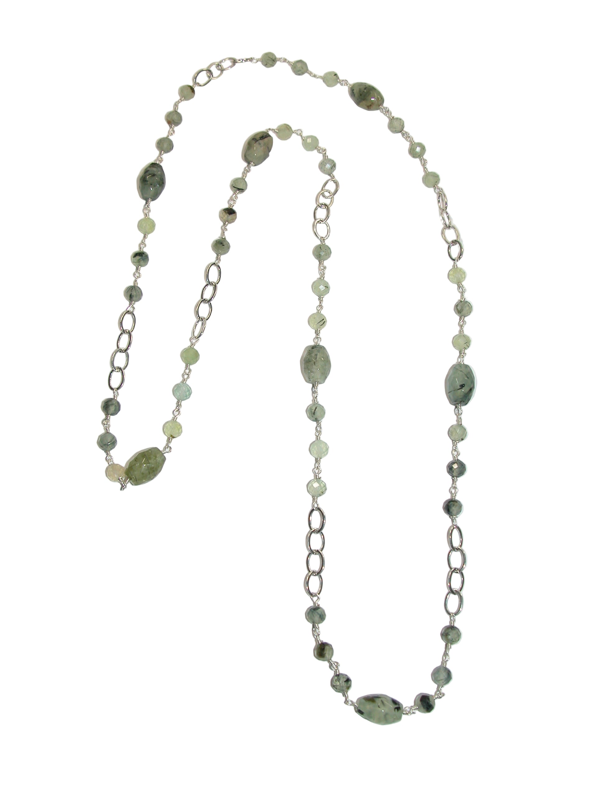 The stones in this necklace are natural prehnite with silver chain. The length of this necklace is 36 inches.