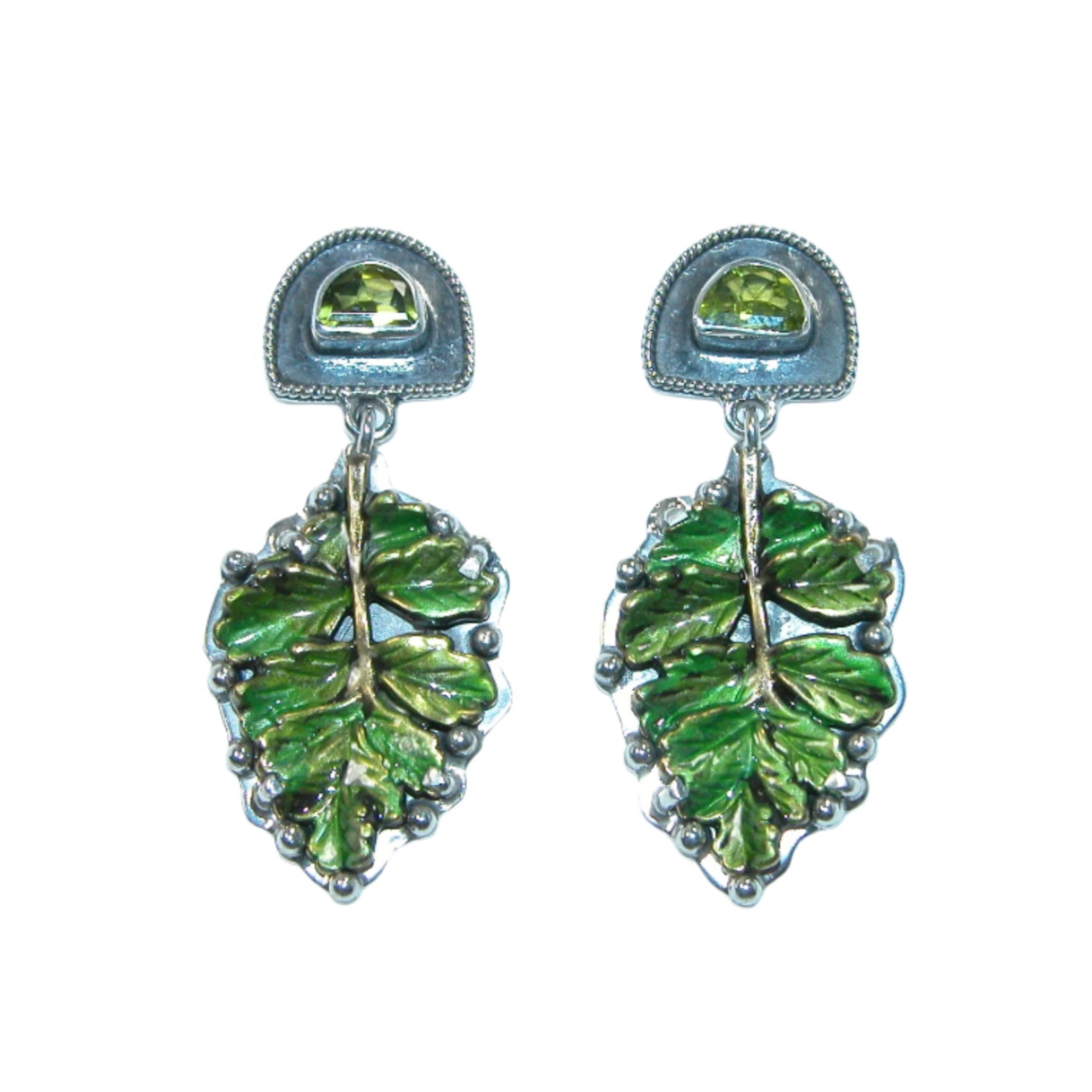 T1057 Peridot Green Hand Enameled Leaf Sterling Silver Drop Earrings