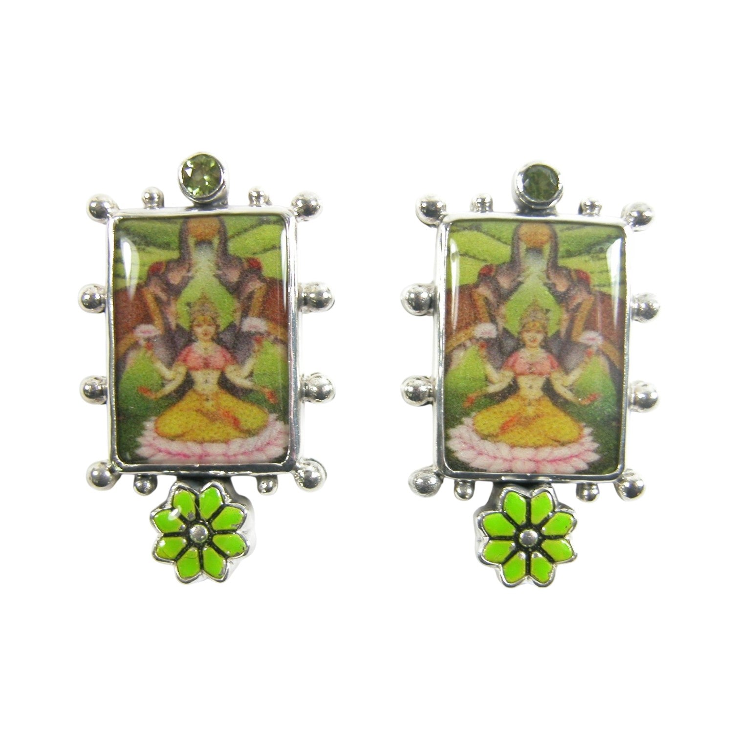 30929 Peridot Hand Made Zen Tile with Hand Enameled Floral Sterling Silver Earrings