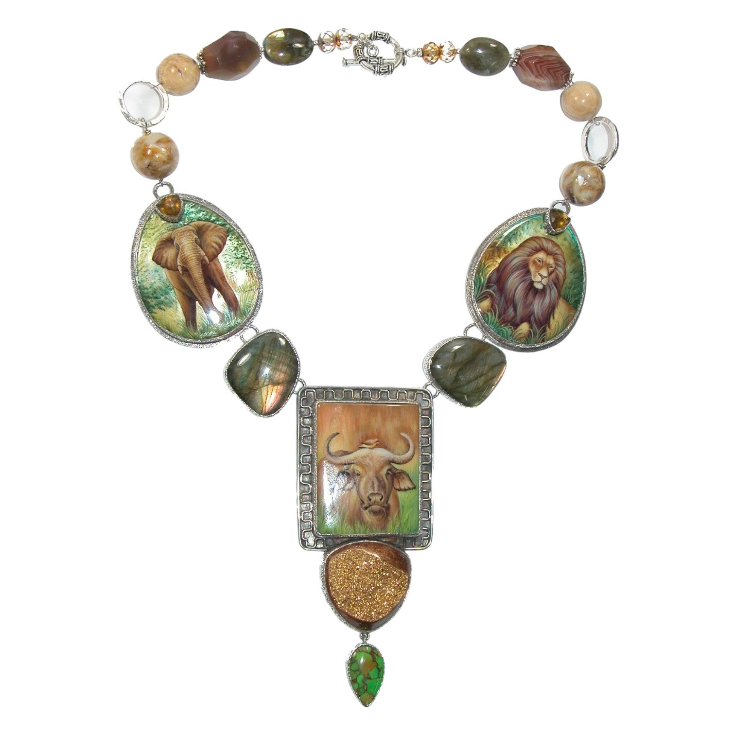 32076 Safari Animal Hand Painted Miniatures on Mother of Pearl, Black Onyx, Labradorite, Whiskey Quartz Necklace