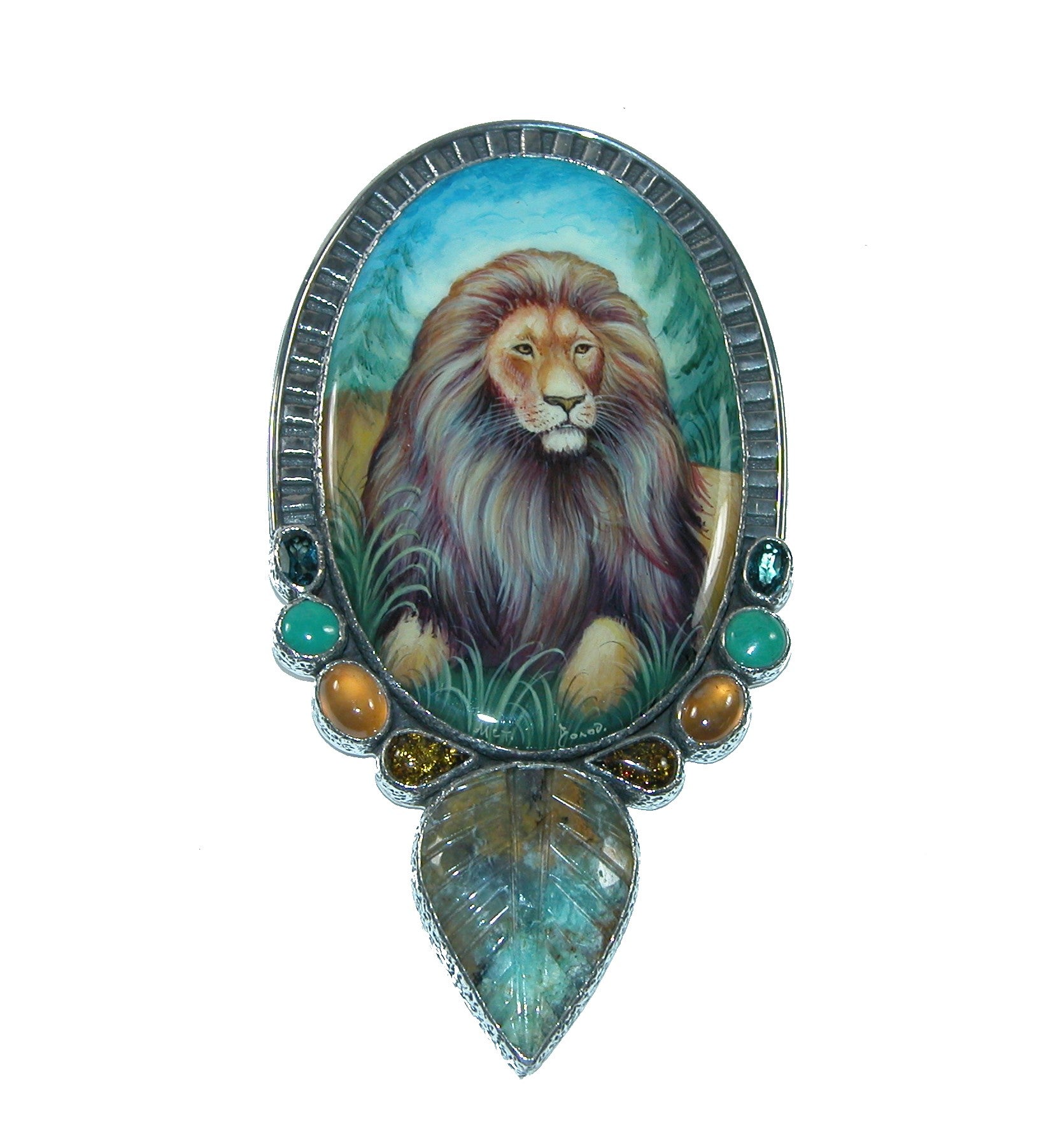 Lion Hand Painted Sterling Silver Pin and Pendant