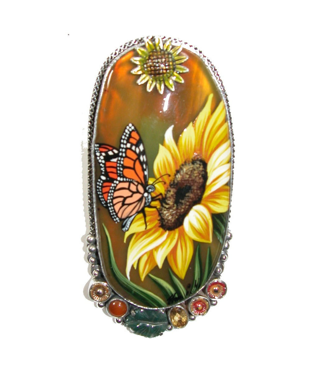 Sunflower and Butterfly Painted on Agate with Jade Leaf on Sterling Silver Pin Pendant