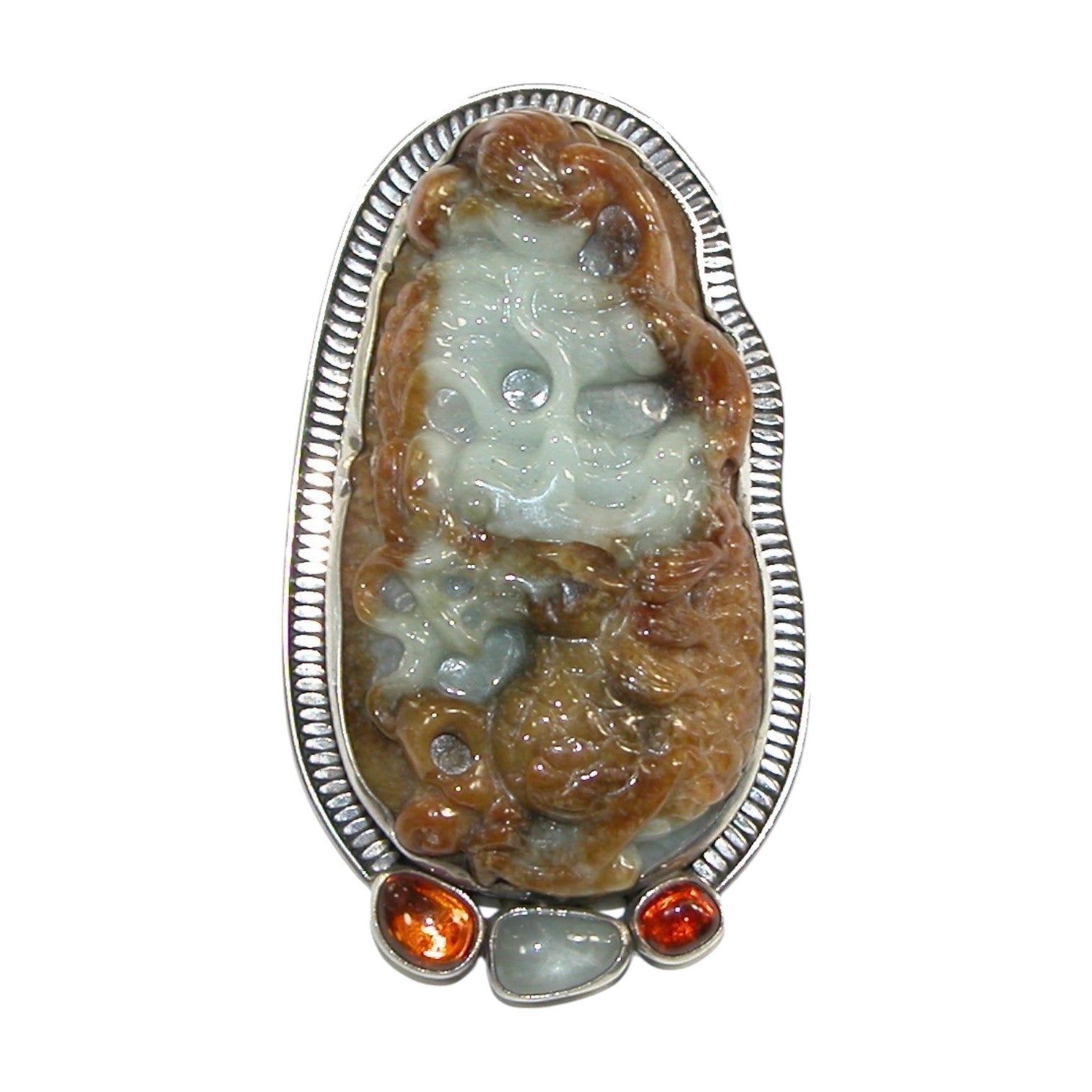 Hand Carved Jade, Moonstone, Hessonite Sterling Silver Pin and Pendant