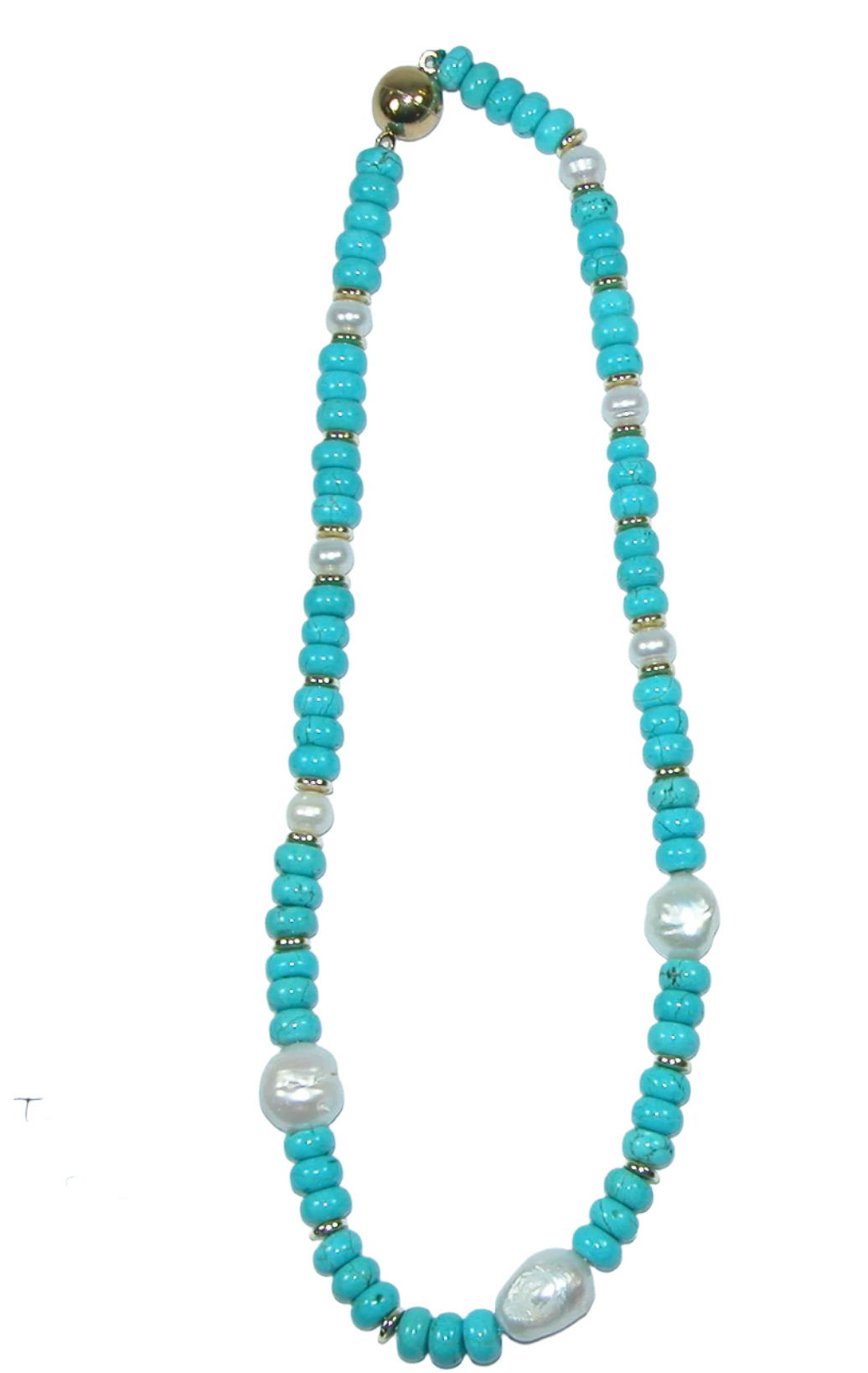 Elevate your ensemble with our exquisite Turquoise and Freshwater Pearl Beaded Necklace. Crafted from Freshwater Pearls and Turquoise beads with gold accents and gold magnetic closure.