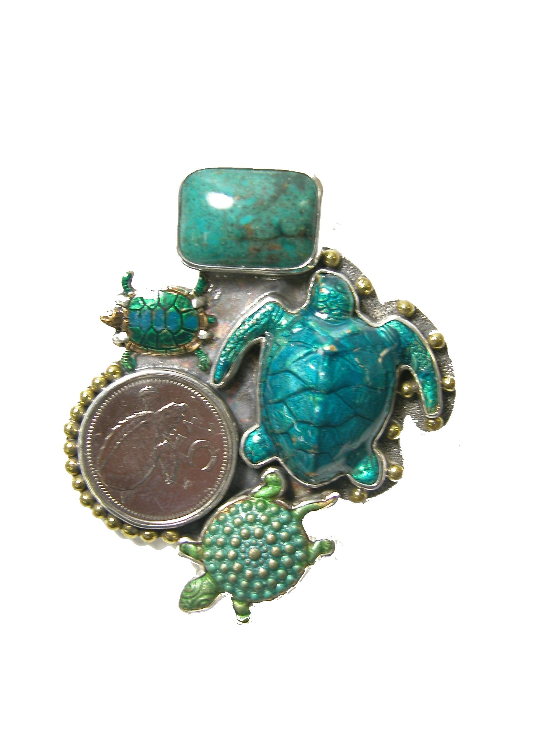 Turquoise Turtle Cluster Sterling Silver Pin and Pendant